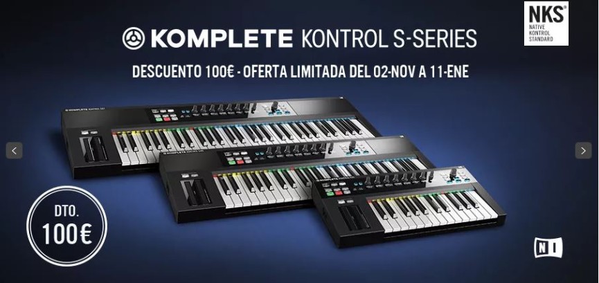 La serie Komplete Kontrol al completo (25, 49 y 61 teclas) está de oferta, por lo que hasta el día 8 de Enero disfrutan de un precio de P.V.P 100 euros inferior a su precio normal (excepto el Komplete Kontrol S88).
